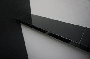 シャワートイレ裏の棚を黒御影石を使い高級感を演出、天井は間接照明、壁1面の壁紙を変えアクセントにしております。