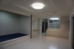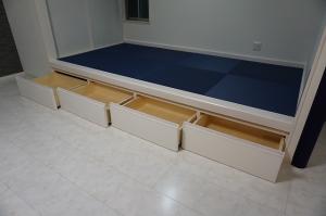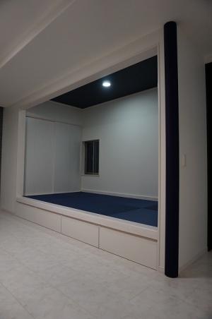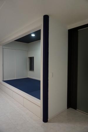 家の中心に鉄骨製の丸柱をブルー、タタミもブルー、玄関タイルもブルーです。タタミコーナーを一段床をあげ引出し収納を4台、取手が無いように工夫しております。